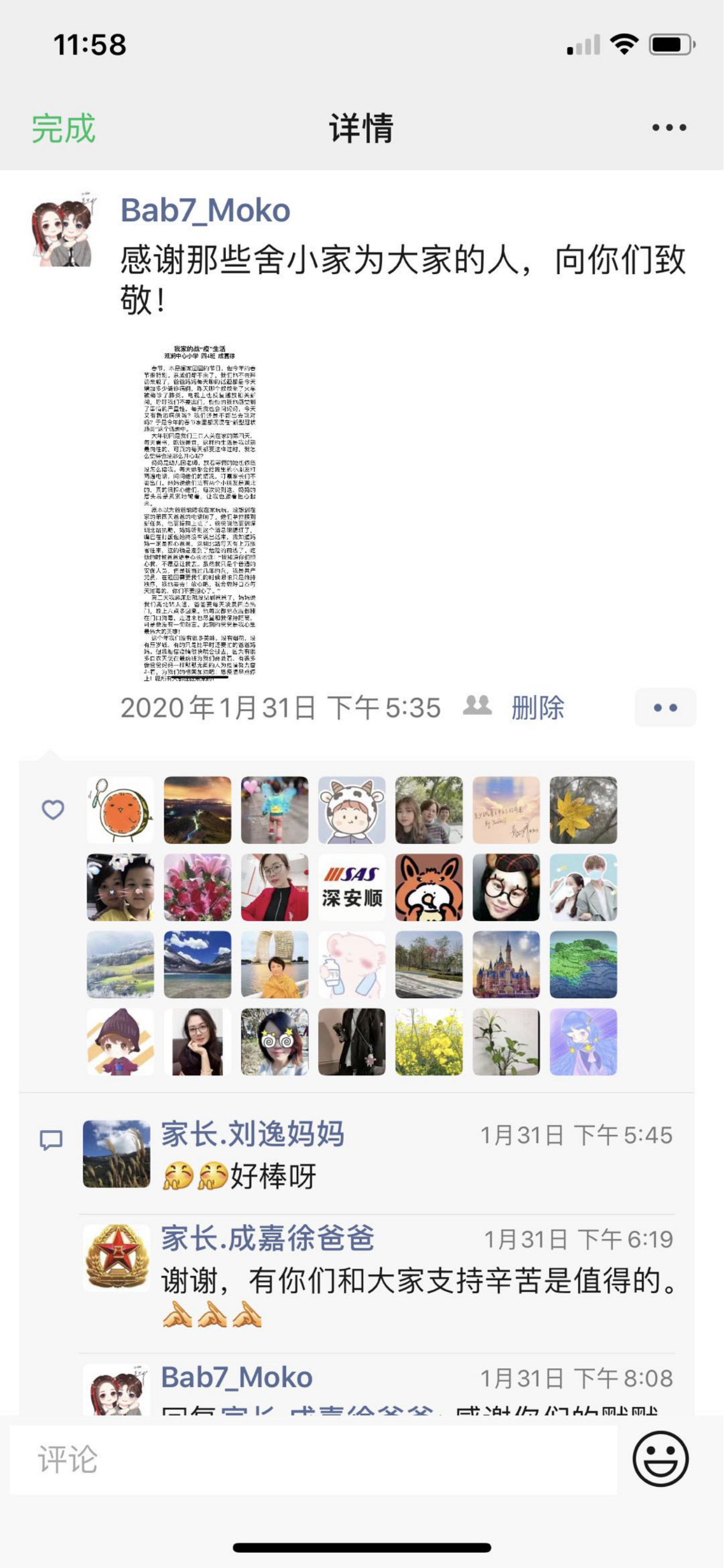 因?yàn)榫W(wǎng)課,班里的學(xué)生有了很多新體驗(yàn),比如嘗試自己做一頓飯,自制放大鏡,和父母一起運(yùn)動鍛煉等。“有位學(xué)生寫了一篇講述他爸爸在抗疫一線忙碌工作的作文,發(fā)給我看讓我指導(dǎo),后來作文在《晶報(bào)》上登了出來,我又把作文發(fā)到班級群里分享,讓大家學(xué)習(xí)這位同學(xué),學(xué)習(xí)他爸爸這種舍小家顧大家的行為,很多家長看到了都為他們點(diǎn)贊?!?/p>