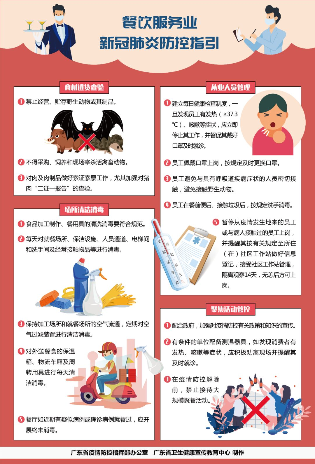 1、嚴(yán)格按照《機(jī)關(guān)、企業(yè)及工廠節(jié)后復(fù)工防控新型冠狀病毒肺炎工作指引》(粵衛(wèi)疾控函〔2020〕14號)、《餐飲服務(wù)食品安全操作規(guī)范》要求以及國家衛(wèi)生健康委員會《新型冠狀病毒感染的肺炎防控方案》《新型冠狀病毒感染的肺炎公眾防護(hù)指南》等防控要求,建立健全防控制度,壓實防控責(zé)任,嚴(yán)格從業(yè)人員管理,杜絕從業(yè)人員帶病上崗。