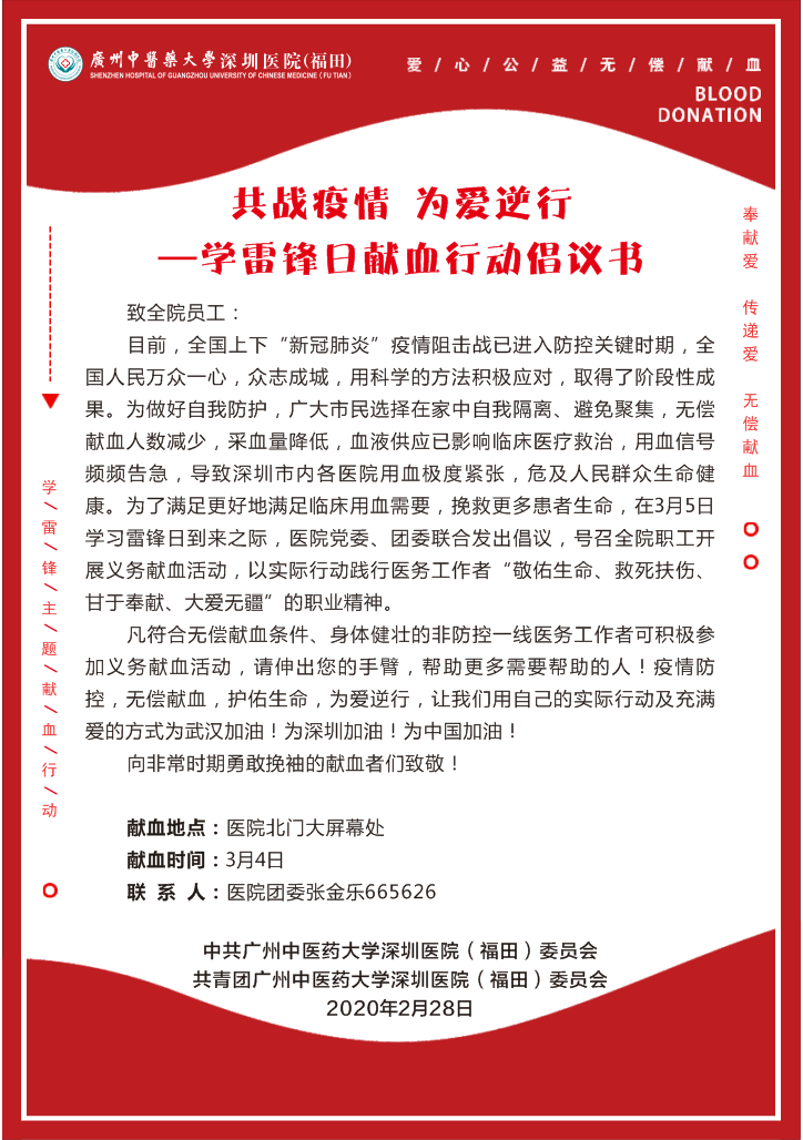 深圳新聞網(wǎng)3月5日訊(見圳客戶端、深圳新聞網(wǎng)記者 何靜 通訊員 馬曉群)受疫情影響,深圳市內(nèi)的血站頻頻告急,在這非常時期,為了更好地滿足深圳市臨床用血需要保障市內(nèi)血液供應,挽救更多患者生命,恰逢第57個“3.5學雷鋒日”到來之際,廣州中醫(yī)藥大學深圳醫(yī)院黨委、團委聯(lián)合發(fā)出“共戰(zhàn)疫情,為愛逆行”倡議書,號召全院職工開展無償獻血活動。