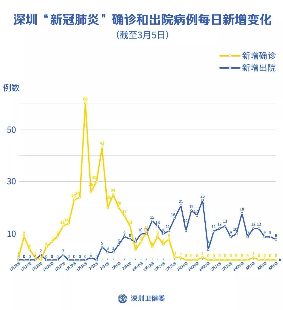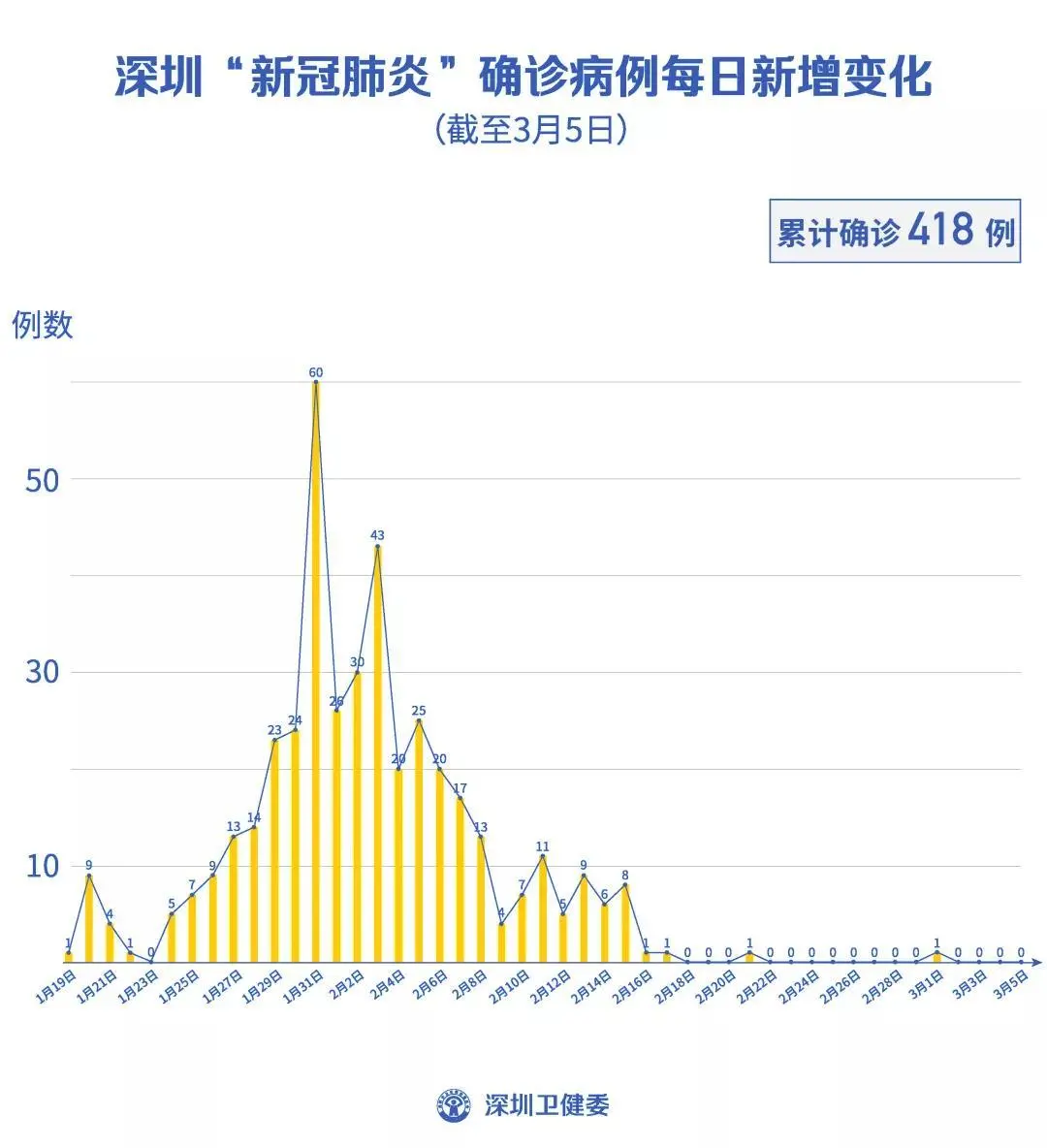 截至3月5日24時(shí),深圳累計(jì)報(bào)告“新冠肺炎”確診病例418例。3月5日當(dāng)天全市無新增確診病例,當(dāng)天出院病例8例(從2月26日起不再公布出院個(gè)案)。 累計(jì)報(bào)告確診病例中,男性198例、女性220例。 按照病例管理地區(qū)劃分,南山區(qū)87例、福田區(qū)82例、龍崗區(qū)71例、寶安區(qū)62例、龍華區(qū)34例、羅湖區(qū)32例、光明區(qū)11例、坪山區(qū)7例、鹽田區(qū)6例、大鵬新區(qū)2例、其他(指由機(jī)場(chǎng)、車站、碼頭、關(guān)口、路卡等直接送往定點(diǎn)醫(yī)院的)24例。 目前,重癥4例、危重癥3例,死亡3例,累計(jì)出院358例。 57例確診病例均在深圳市第三人民醫(yī)院隔離治療。 97例密切接觸者正在接受醫(yī)學(xué)觀察。 資料來源:深圳市疾控中心、深圳市衛(wèi)健委、廣東省衛(wèi)健委
