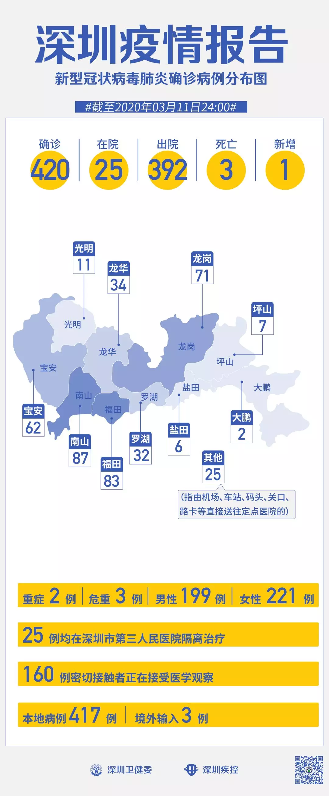 截至3月11日24時(shí),深圳累計(jì)報(bào)告“新冠肺炎”確診病例420例。3月11日當(dāng)天全市新增確診病例1例,當(dāng)天出院病例5例(從2月26日起不再公布出院個(gè)案)。