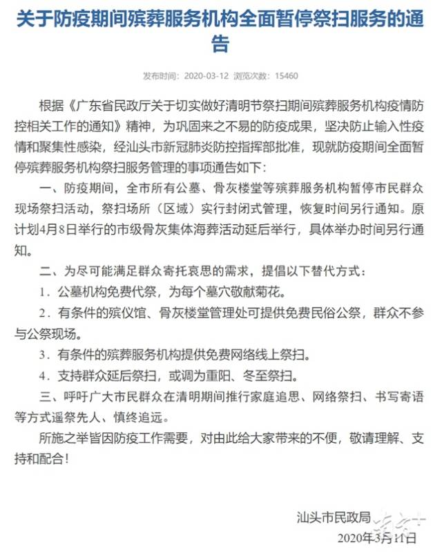 據(jù)統(tǒng)計,截至3月15日17時,深圳、汕頭、中山等地發(fā)文明確,全市暫停祭掃服務(wù),倡導(dǎo)通過家庭追思、網(wǎng)絡(luò)祭掃、書寫寄語等方式遙祭先人、慎終追遠(yuǎn)。此外,韶關(guān)市殯儀館暫停2020年清明祭祀活動。