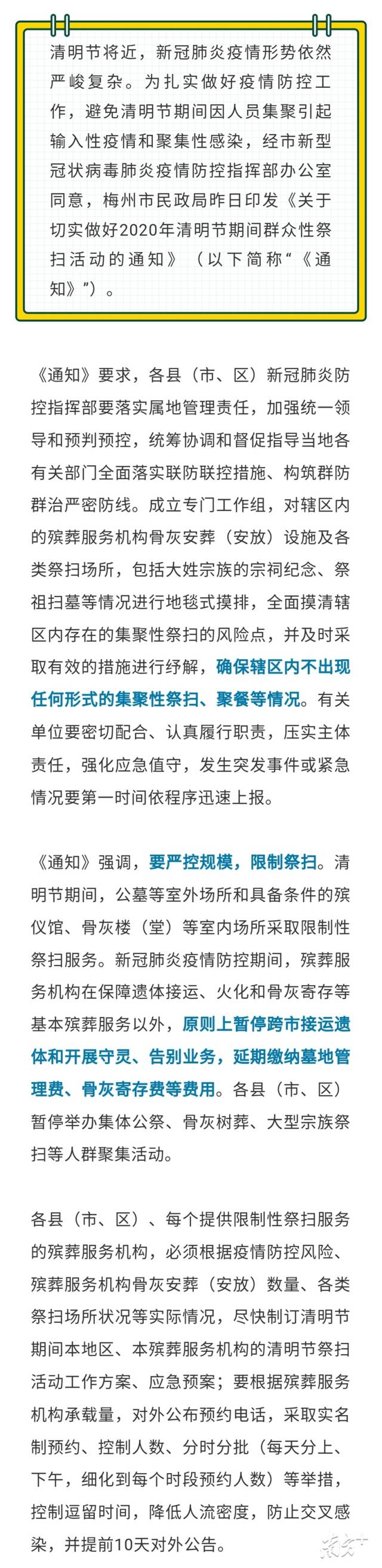 根據(jù)要求,廣東暫停舉辦集體公祭、骨灰海葬、骨灰樹葬等人群聚集活動。各地級以上市新冠肺炎防控指揮部要盡快研究決定清明節(jié)期間本地區(qū)殯葬服務(wù)機(jī)構(gòu)暫?;蛘呦拗萍罀叻?wù),并對外公告。疫情防控風(fēng)險較高的,暫停祭掃服務(wù);具備條件且防控措施落實到位的,可提供限制性祭掃服務(wù)。