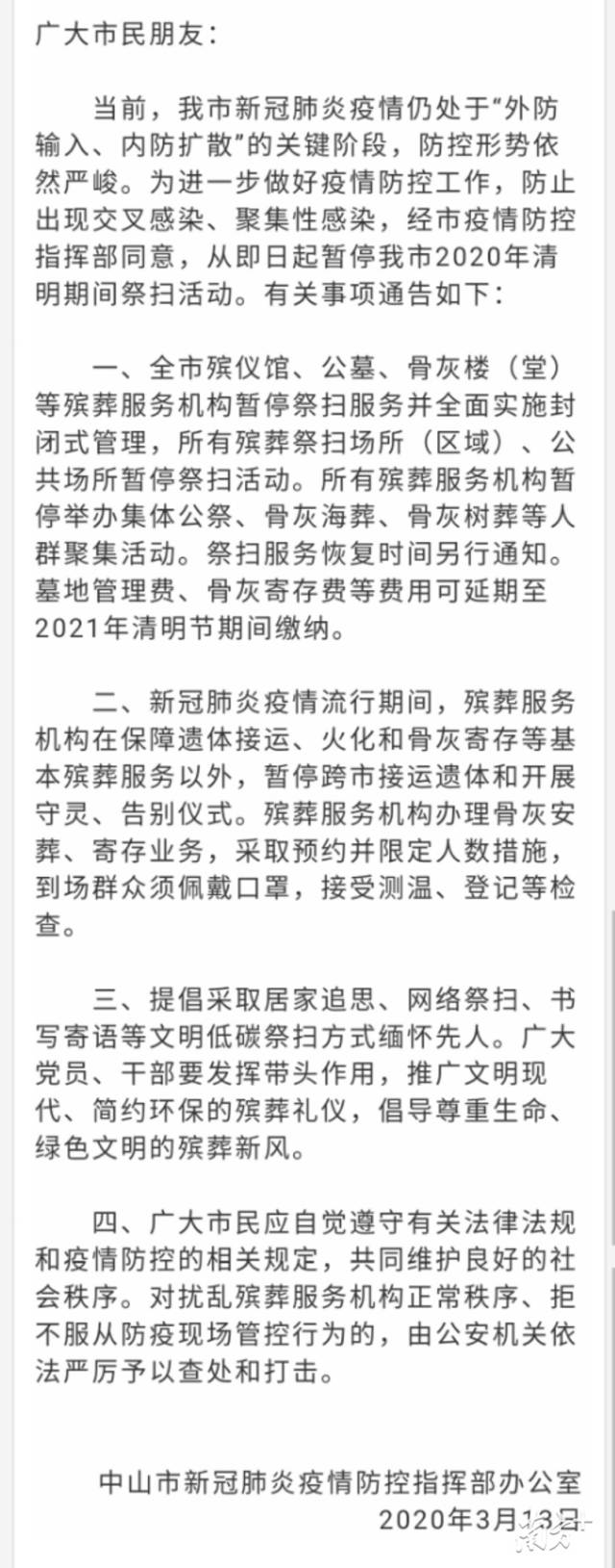 中山全市所有殯葬祭掃場所(區(qū)域)、公共場所暫停祭掃活動。殯葬服務(wù)機(jī)構(gòu)辦理骨灰安葬、寄存業(yè)務(wù),采取預(yù)約并限定人數(shù)措施。