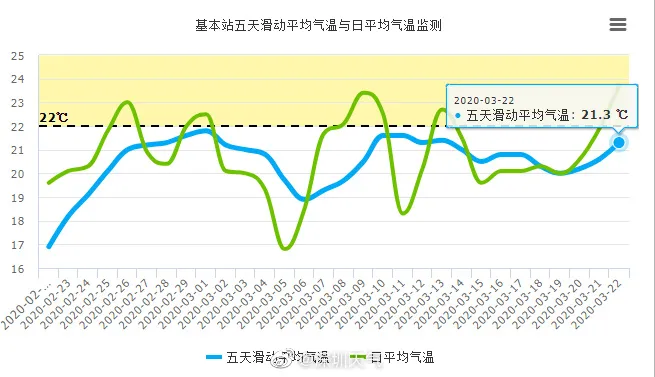 以5天滑動(dòng)平均氣溫穩(wěn)定>22 ℃ 為春季結(jié)束、夏季開(kāi)始,看圖一中的藍(lán)色曲線(五天滑動(dòng)平均氣溫)已經(jīng)在抬頭了,能不突破虛線還得看接下來(lái)幾天的氣溫。