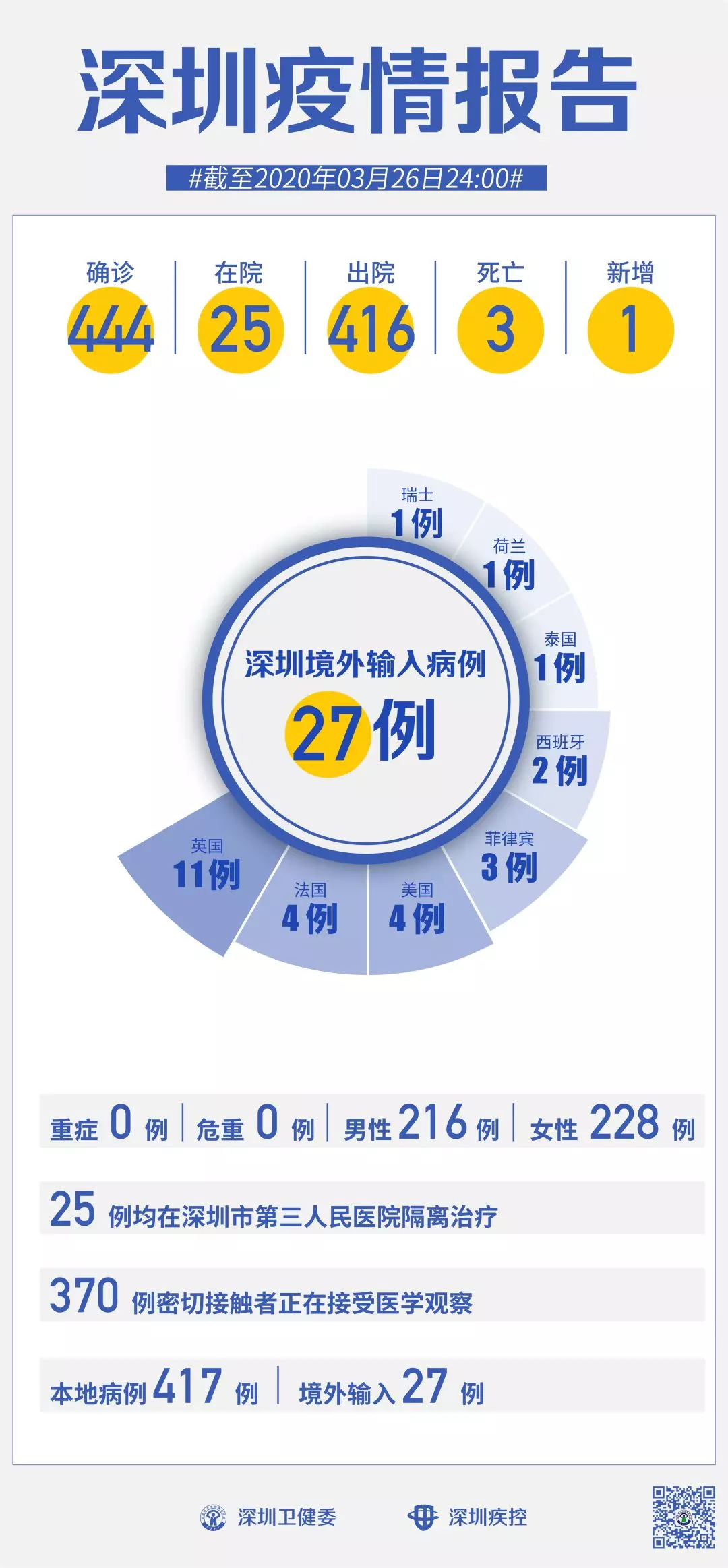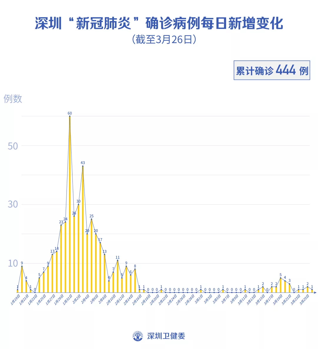 截至3月26日24時,深圳累計報告“新冠肺炎”病例444例。3月26日當天新增1例,出院1例。