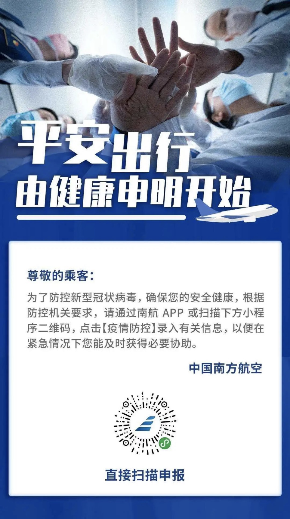 目前南航啟用“旅客健康申明”線上填寫(xiě),方便快捷,請(qǐng)自覺(jué)申報(bào)支持乘機(jī)疫情防控工作。