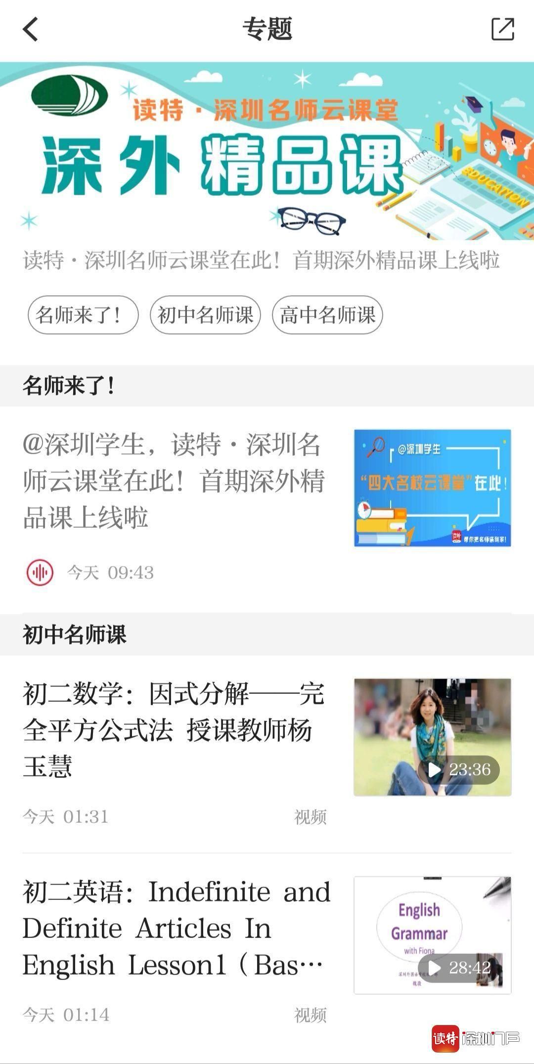 教育頻道置頂位置就可看到“讀特·名師云課堂”