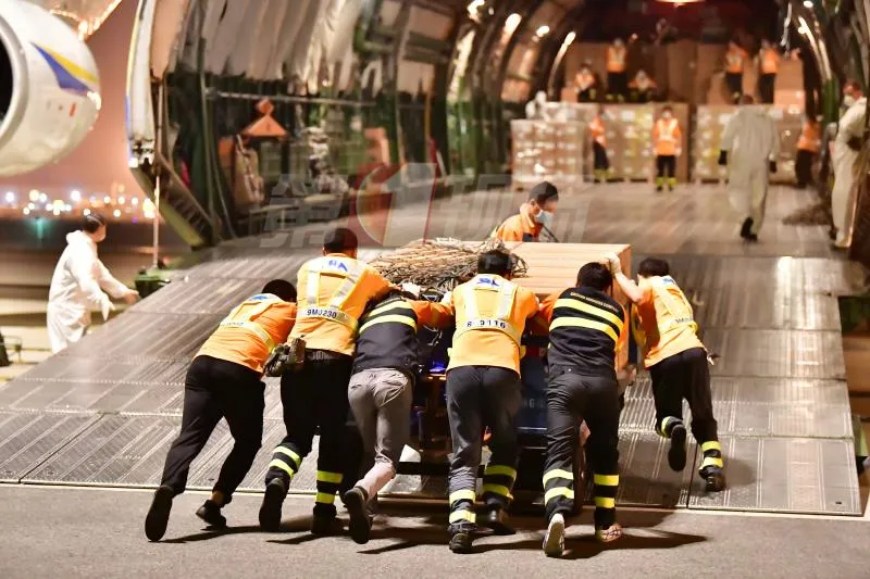 3月23日晚上,在深圳機(jī)場(chǎng)389機(jī)位,機(jī)場(chǎng)人員喊著口號(hào),用力將裝滿(mǎn)物資的貨卡由機(jī)艙口的斜坡推進(jìn)貨艙。經(jīng)過(guò)9個(gè)小時(shí)的忙碌,終于將裝滿(mǎn)110個(gè)貨卡、29塊大貨板的防疫物資全部裝上了這架空中“巨無(wú)霸”,近70噸防疫物資從深圳運(yùn)往捷克首都布拉格。