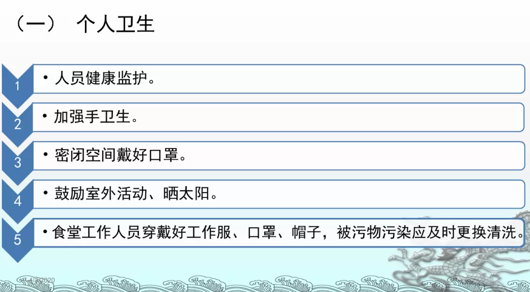 五是做好教育培訓(xùn)工作。學(xué)校要開(kāi)展多種形式的健康宣教,普及新冠肺炎防控知識(shí),組織師生學(xué)習(xí)教育部和市教育局下發(fā)的各類指南和防疫知識(shí)。