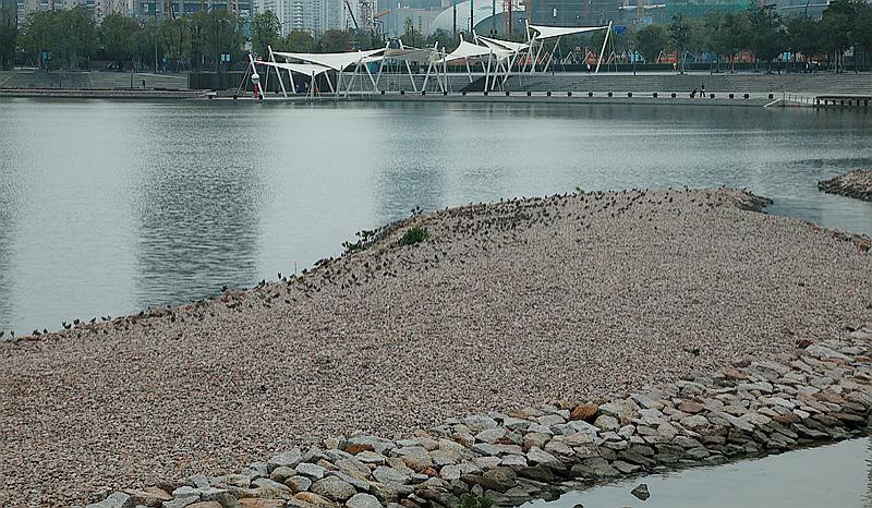記者在采訪中了解到,2017年初,深圳觀鳥人士發(fā)現(xiàn)人才公園建設(shè)接近尾聲,人工島嶼種植了密集的植物。深圳市觀鳥協(xié)會隨即向人才公園建設(shè)主管部門提出《人才公園鳥類棲息地改善建議》。相關(guān)政府部門在征詢了廣東內(nèi)伶仃福田國家級自然保護(hù)區(qū)管理局、市野生動植物保護(hù)管理處、南山區(qū)城管局和深圳市觀鳥協(xié)會的意見和建議后,就協(xié)調(diào)處理人才公園水鳥棲息地等問題達(dá)成了一致意見,決定在適當(dāng)位置增加浮灘,增加水鳥停留棲息的空間。整改后的人工碎石灘,很快便吸引了大量的鸻鷸類候鳥前來停棲。"這個人工石灘的距離適中,既方便人類觀察,又不至于讓鳥兒感覺受到威脅,這么多年來,人與候鳥之間一直相安無事,鳥兒也已經(jīng)習(xí)慣了這里的環(huán)境,所以它們才能在人類的眼皮底下安心地打盹兒。""PT"向記者介紹說。