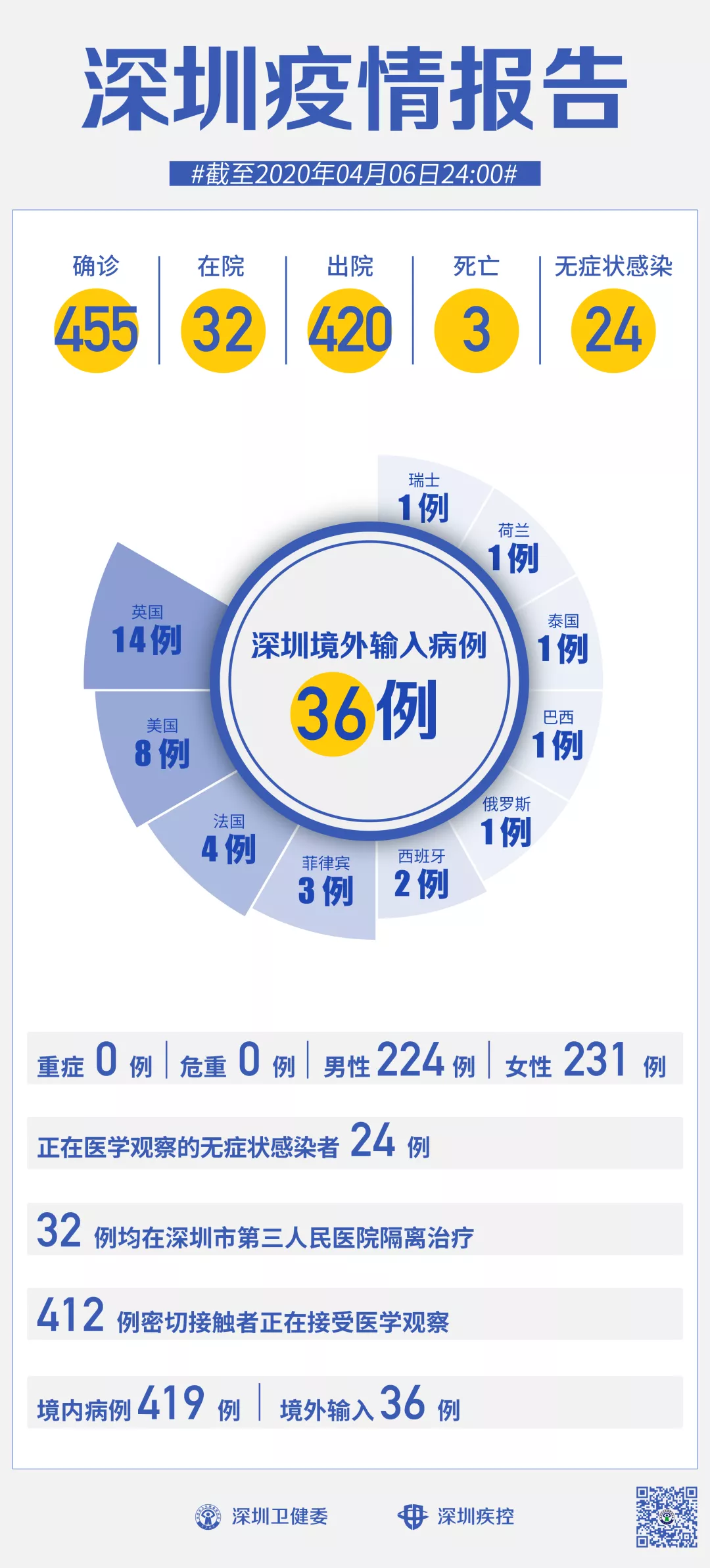 截至4月6日24時,深圳累計報告新冠肺炎病例455例。4月6日當(dāng)天新增無癥狀感染者1例。