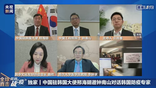 4月10日15時(shí),中國駐韓國大使邢海明邀請鐘南山院士與韓國防疫專家李鐘求教授在線交流。鐘南山專門制作了一個(gè)題為“抗擊新冠肺炎的中國經(jīng)驗(yàn)”的PPT,向韓國朋友介紹中國經(jīng)驗(yàn)。