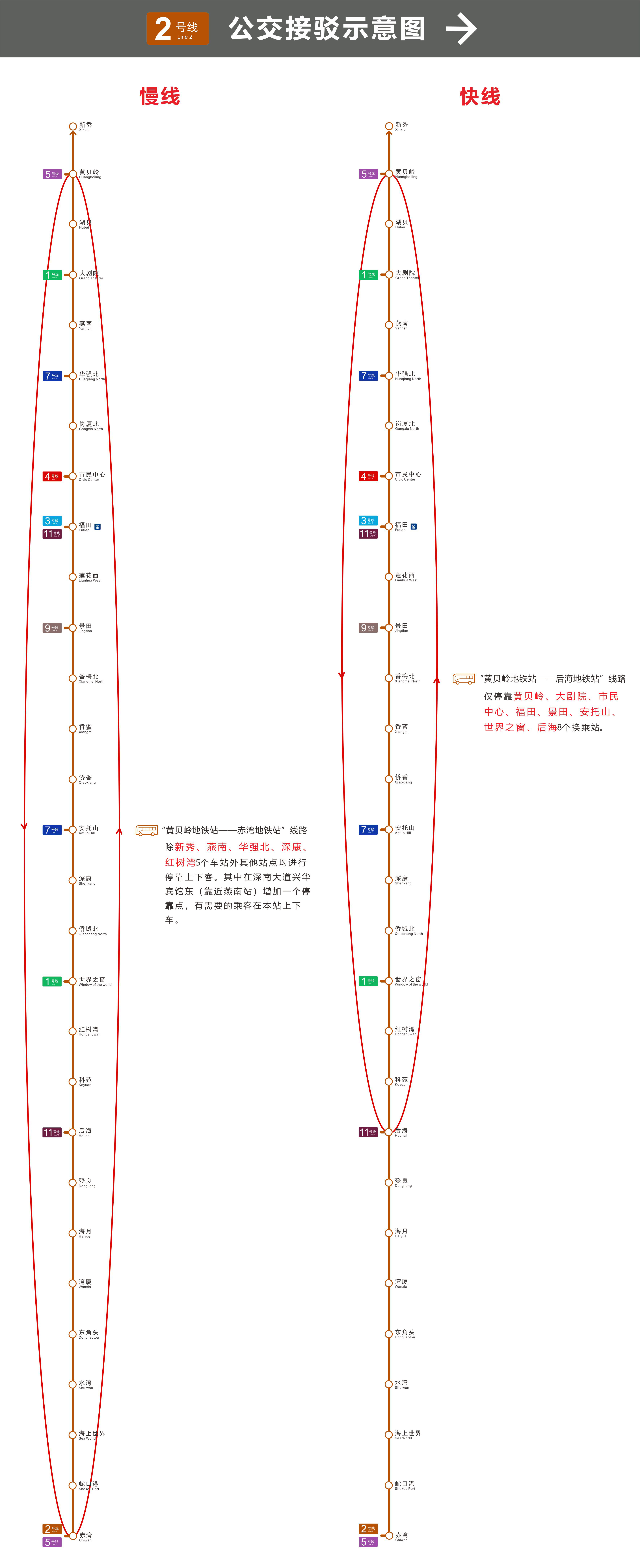 為了方便期間市民乘客的出行,屆時(shí)將組織循環(huán)開行2號(hào)線的兩條公交接駁線路。1、公交接駁慢線:“黃貝嶺站—赤灣站”。除新秀、燕南、華強(qiáng)北、深康、紅樹灣5個(gè)站點(diǎn)不??恐猓溆喔髡揪?可舷驴汀?、公交接駁快線:“黃貝嶺站—后海站”。僅停靠黃貝嶺、大劇院、市民中心、福田、景田、安托山、世界之窗、后海共8個(gè)換乘站。