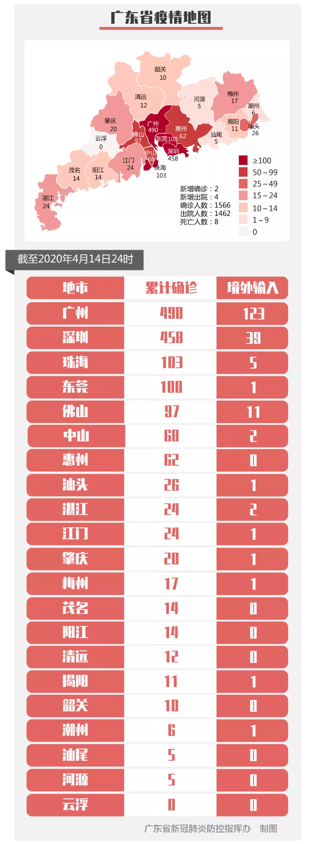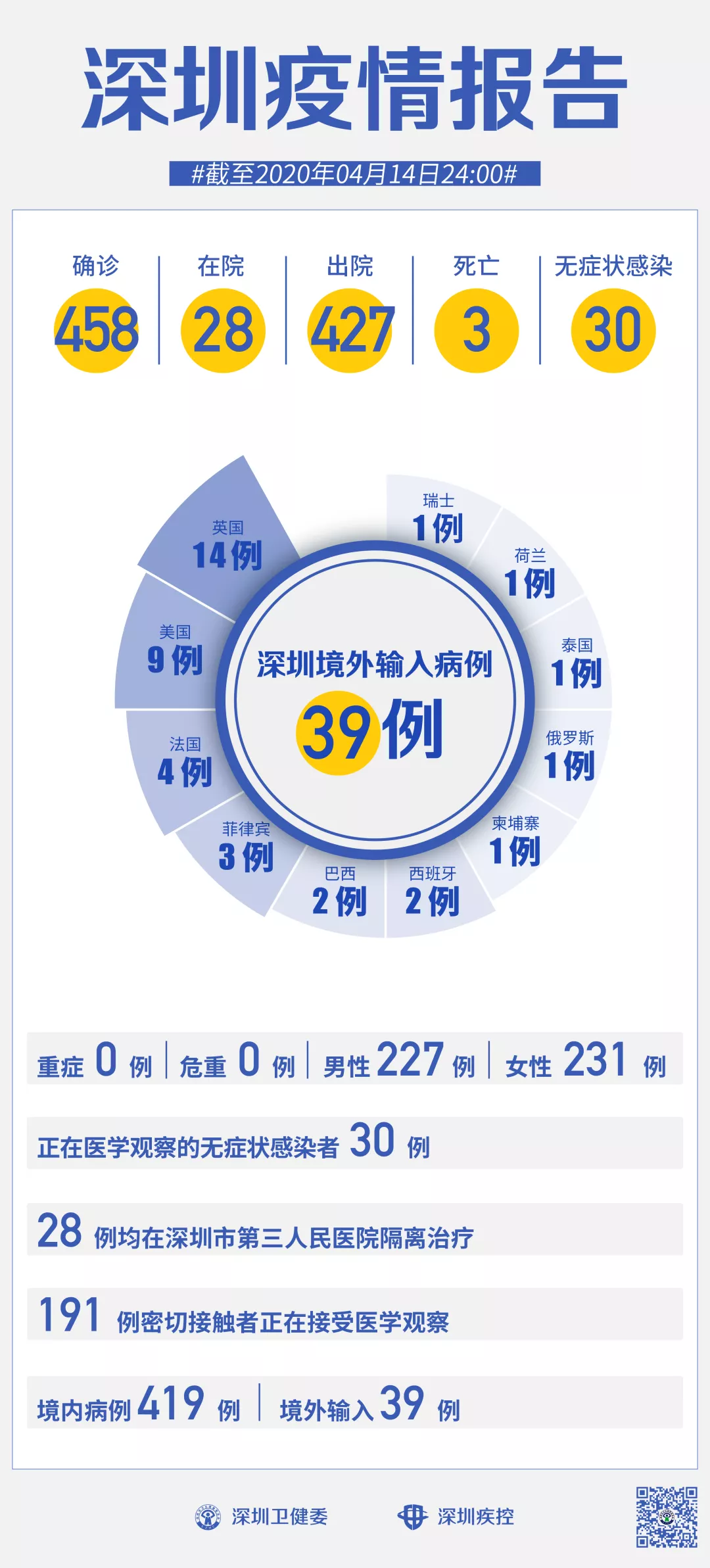 截至4月14日24時,深圳累計報告新冠肺炎病例458例。4月14日當天新增出院3例。