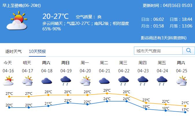 見圳客戶端·深圳新聞網(wǎng)2020年4月16日訊 我市今天到明天多云間晴天,16日早晚有輕霧,氣溫20-27℃;南風(fēng)2級(jí);相對(duì)濕度65%-90%。早晚稍涼,午間體感較熱,注意及時(shí)增減衣物;出門要注意防曬,戶外活動(dòng)需注意及時(shí)補(bǔ)充水分。