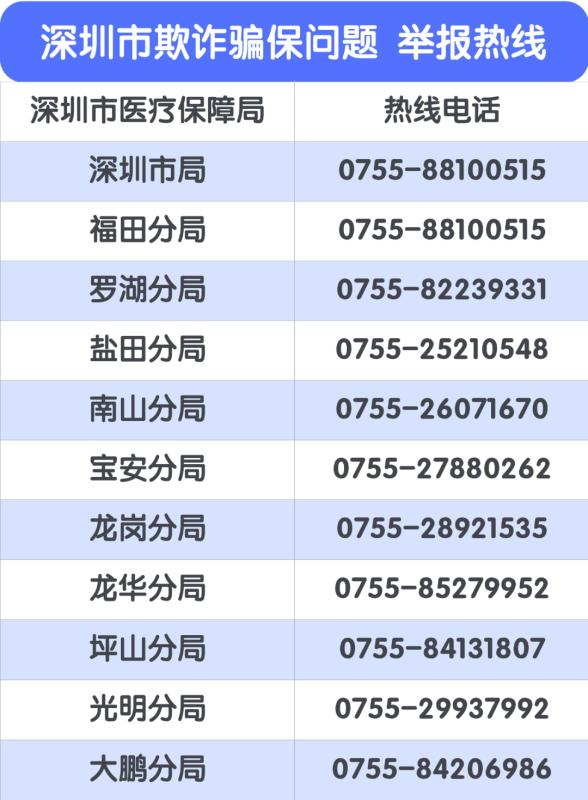 市醫(yī)保局已在深圳市各區(qū)設立投訴舉報電話,歡迎廣大市民共同參與醫(yī)?;鸨O(jiān)督管理。市民可通過實名舉報和匿名舉報方式檢舉、揭發(fā)欺詐騙保行為,經查證屬實的,將根據《深圳市欺詐騙取醫(yī)療保障基金行為舉報獎勵實施細則(試行)》對舉報人予以獎勵,獎金最高可達10萬元?。ㄓ浾?莊瑞玉)