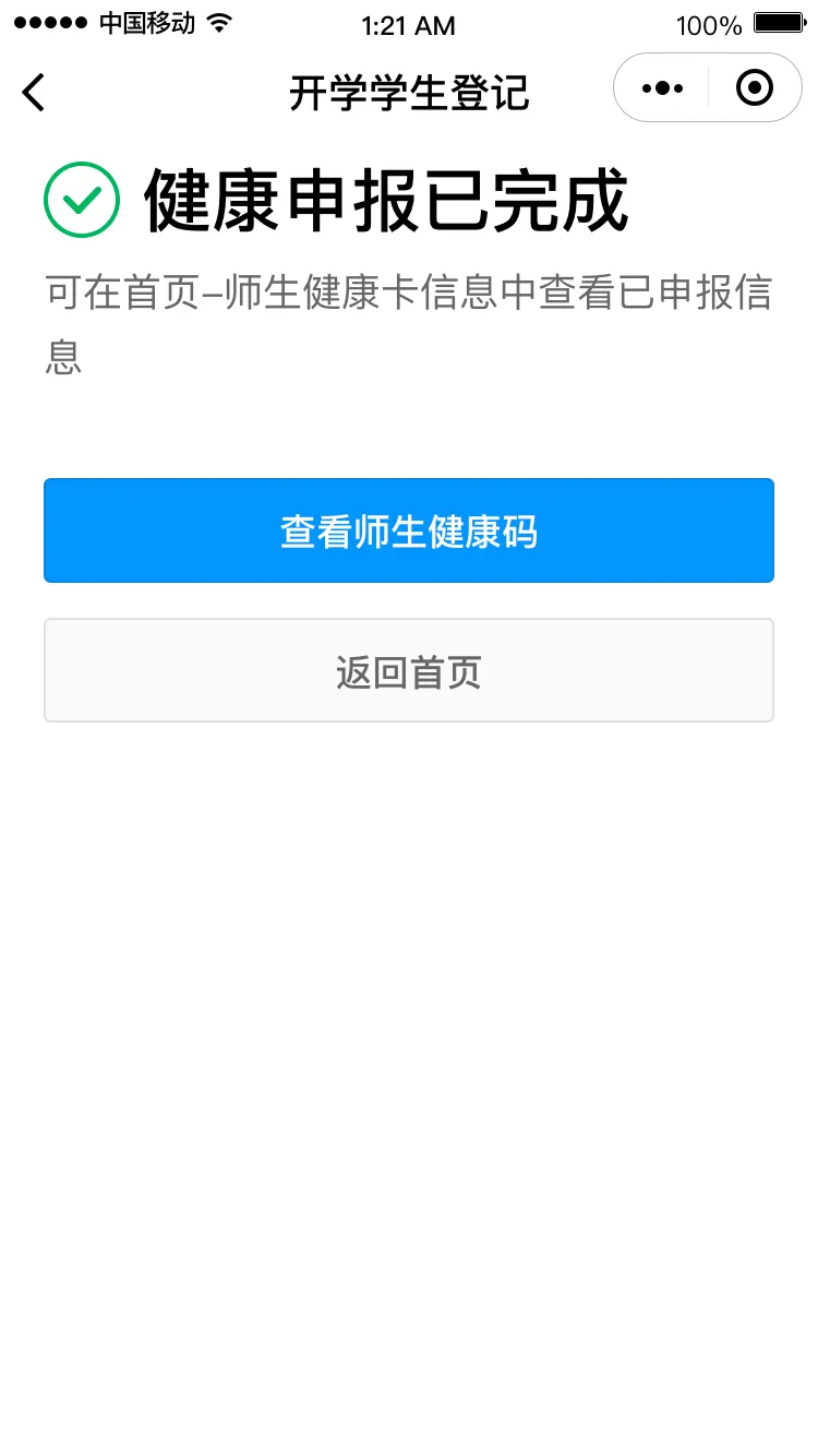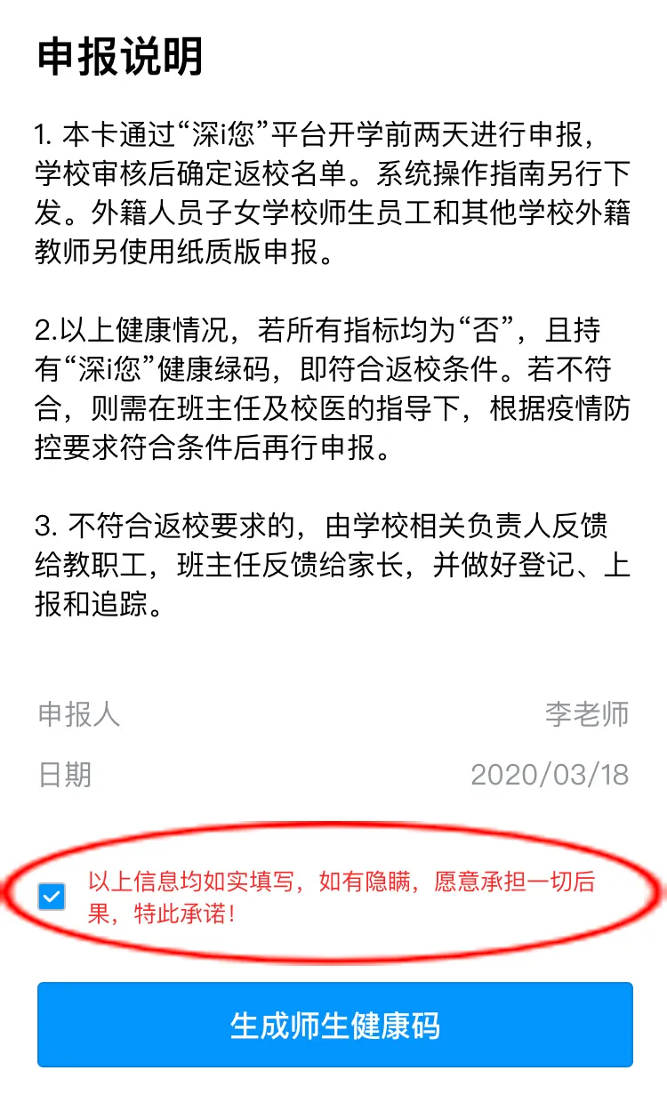 健康信息申報后,請勾選申報承諾,點(diǎn)擊“生成師生健康碼”即可完成健康申報。