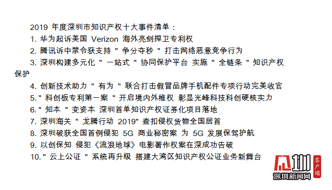 值得關注的是,在深圳市知識產(chǎn)權工作會議期間,全市2019年度知識產(chǎn)權十大事件正式對外發(fā)布,華為起訴美國Verizon、騰訊訴中禁令獲支持、“有為”聯(lián)合打擊假冒品牌手機配件專項行動完美收官等事件上榜。