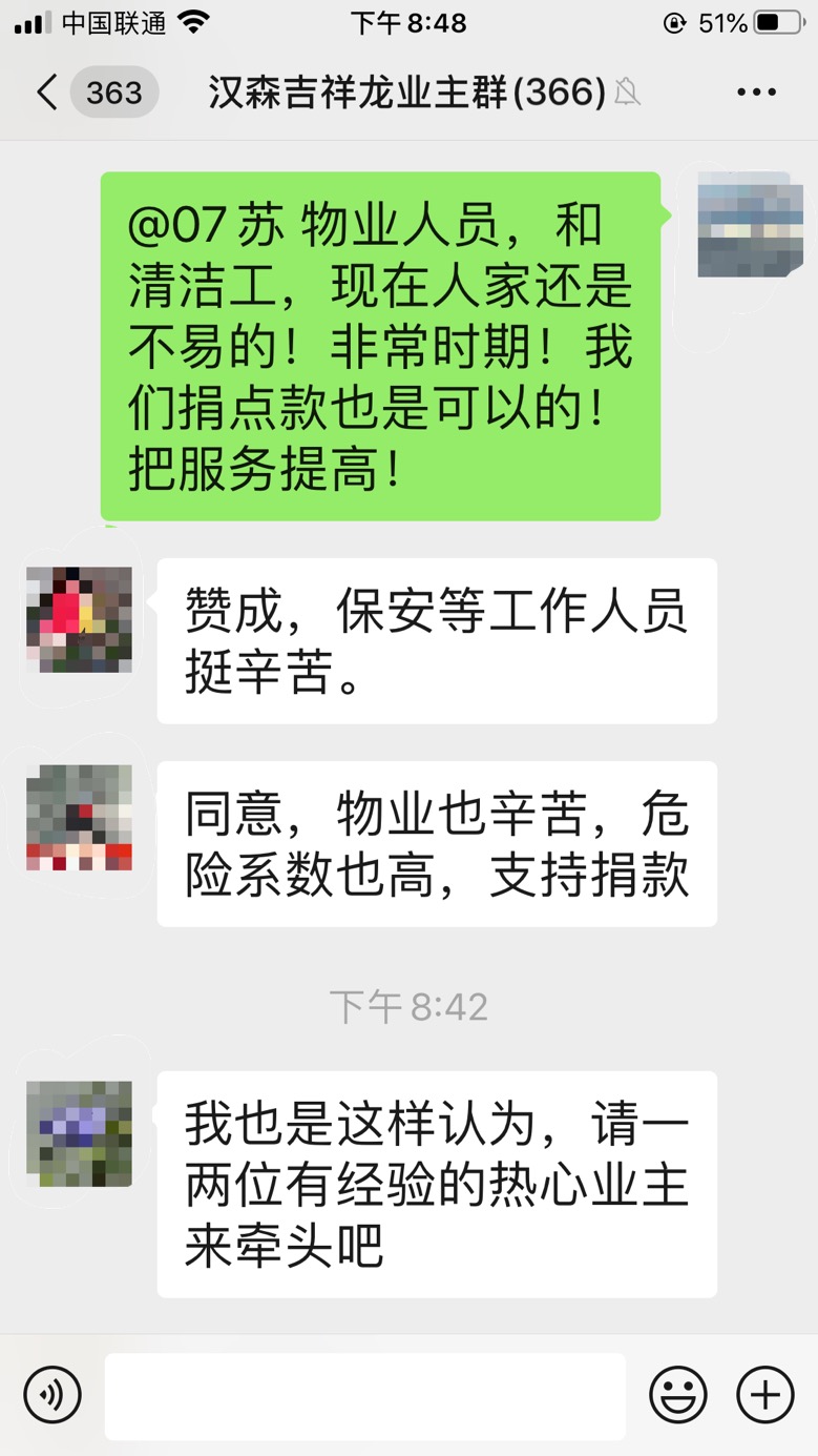 原來(lái),吉祥龍小區(qū)業(yè)主因?yàn)橛X(jué)得物業(yè)一線工作人員抗戰(zhàn)疫情工作危險(xiǎn)又更辛苦,便在微信群內(nèi)發(fā)起了給本小區(qū)物業(yè)人員捐款的倡議,收到了眾多業(yè)主的熱烈反響?!百澇桑0驳裙ぷ魅藛T挺辛苦”、“同意,物業(yè)也辛苦,危險(xiǎn)系數(shù)也高,支持捐款”……業(yè)主們通過(guò)討論,約定好捐贈(zèng)方式全憑自愿、不搞強(qiáng)制、不論數(shù)額、謹(jǐn)表心意。短短一小時(shí),捐贈(zèng)金額就達(dá)到了3萬(wàn)余元。業(yè)主余小姐表示,吉祥龍小區(qū)業(yè)主和物業(yè)人員在防疫過(guò)程中正團(tuán)結(jié)一心、關(guān)系緊密,一定能保護(hù)好小區(qū)安全。