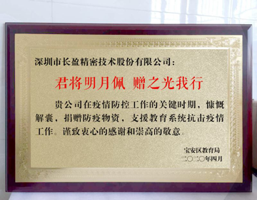 “君將明月佩,贈之光我行”,接收物資后,寶安區(qū)教育局為長盈精密公司贈送題詞牌匾,以表示對該公司在防疫關鍵時期慷慨解囊,支援教育系統(tǒng)抗擊疫情工作的感謝和敬意。