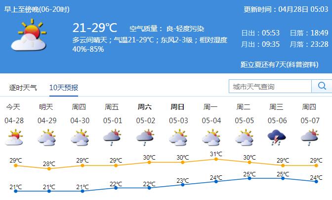 見圳客戶端·深圳新聞網(wǎng)2020年4月28日訊 28日多云間晴天,氣溫21-29℃,東風(fēng)2-3級,相對濕度40%-85%;29-30日多云為主,空氣較干燥;5月1-5日轉(zhuǎn)偏南暖濕氣流影響,多云,部分時間有分散陣雨,早晚有輕霧。