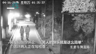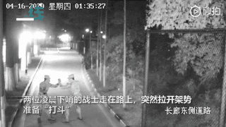 兩位凌晨下哨的戰(zhàn)士走在路上,突然間拉開架勢,準(zhǔn)備“打斗”。劍拔弩張之際,突然畫風(fēng)一轉(zhuǎn),兩人做起了互相加油打氣的動作。