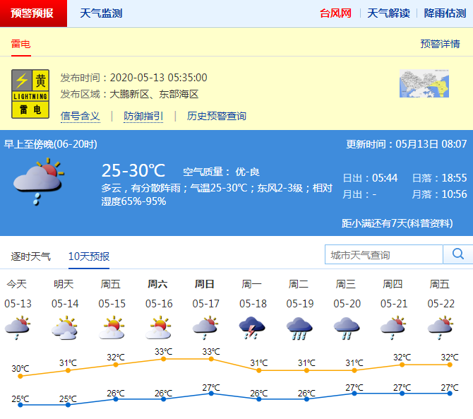 預(yù)計(jì)13日多云間陰天,氣溫24-29℃;14-17日多云到晴天,局部偶有短時(shí)陣雨或雷陣雨,最高氣溫可達(dá)32-33℃,天氣漸趨悶熱;展望18-19日有一次明顯降雨過程。