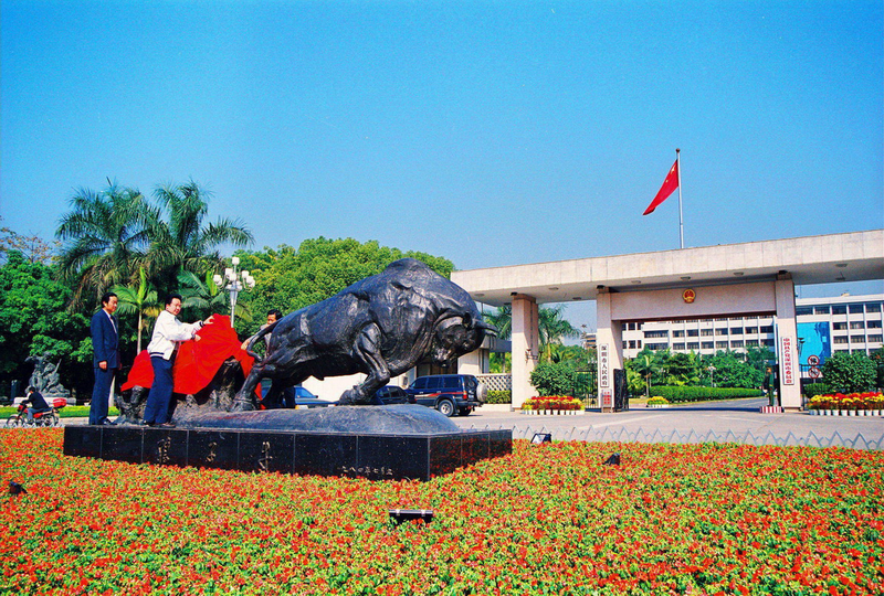 在深南大道,深圳市委大院門前,有一座深圳人最熟悉的銅雕——“孺子?!钡袼埽灿腥朔Q它為“拓荒?!薄K?噸、長5.6米、高2米、基座高1.2米、以花崗石磨光石片為底座;牛頭抵地,四腿后蹬,全身緊繃,肌肉線條極具張力,給人竭盡全力的負重感;牛身后則拉起一堆腐朽樹根。這座銅雕造型鮮明地體現(xiàn)出深圳人勇于開拓、大膽創(chuàng)新、無私奉獻、奮勇前進的精神。
