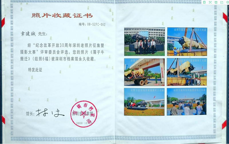 “一開始,我提出這個遷移建議時,還是有點忐忑的,后來得知‘孺子?!袼軐⒁浦潦形笤和夂螅曳浅8吲d,這樣一來,跟‘孺子牛’合影就方便多了呀!”“孺子?!钡袼苓w移當(dāng)天,韋建誠興奮地拿起相機,用鏡頭定格下整個搬遷過程。“那一天是我人生最難忘的日子之一,既是我44歲生日,又是‘孺子?!袼馨残录抑??!被貞浧甬?dāng)時的情況,韋建誠還是十分興奮。而韋建誠拍攝的組照后來被深圳市檔案館永久收藏。深圳市委辦公廳還將《市民希望將“孺子?!钡袼芤浦潦懈笤和狻吩u為一等獎。