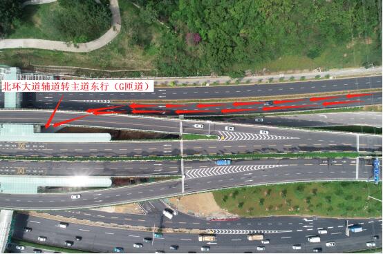 北環(huán)大道主道轉(zhuǎn)上步北路南行路口封閉作應急使用,為緩解輔路壓力,北環(huán)大道輔道轉(zhuǎn)上步北路南行由原一車道改為兩車道,新增的車道于5月18日同步開通。