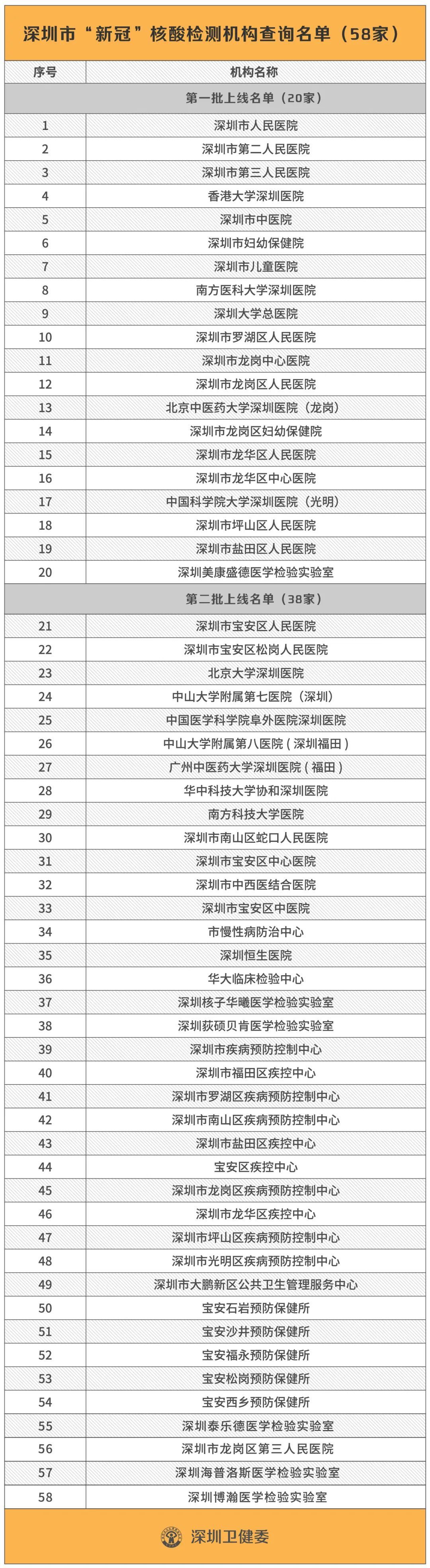 目前,深圳共有58家機構開展新冠病毒核酸檢測,包括35家醫(yī)院、16家公共衛(wèi)生機構和7家第三方檢測機構。