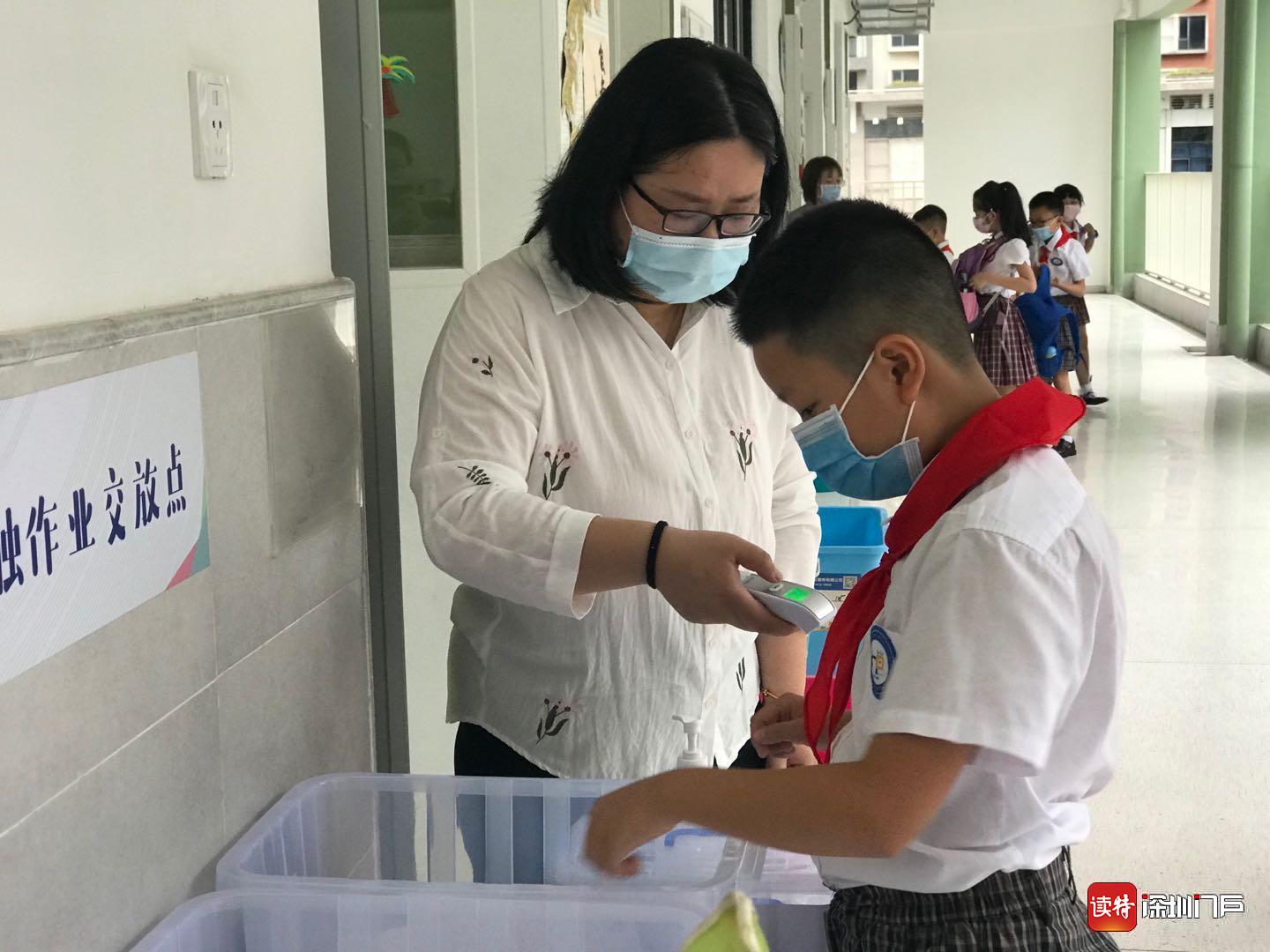 “同學(xué)們?cè)缟虾茫 薄袄蠋焸兒?!?8日一大早,龍華區(qū)和平實(shí)驗(yàn)小學(xué)的老師們都早早做好準(zhǔn)備,站在學(xué)校門(mén)口,迎接孩子們歸來(lái)。在各班教室門(mén)口,學(xué)校還貼心的準(zhǔn)備了“無(wú)接觸作業(yè)交站點(diǎn)”,同學(xué)們按順序自覺(jué)將學(xué)科作業(yè)放進(jìn)箱內(nèi),減少了不必要的接觸。(讀特記者何亞南)