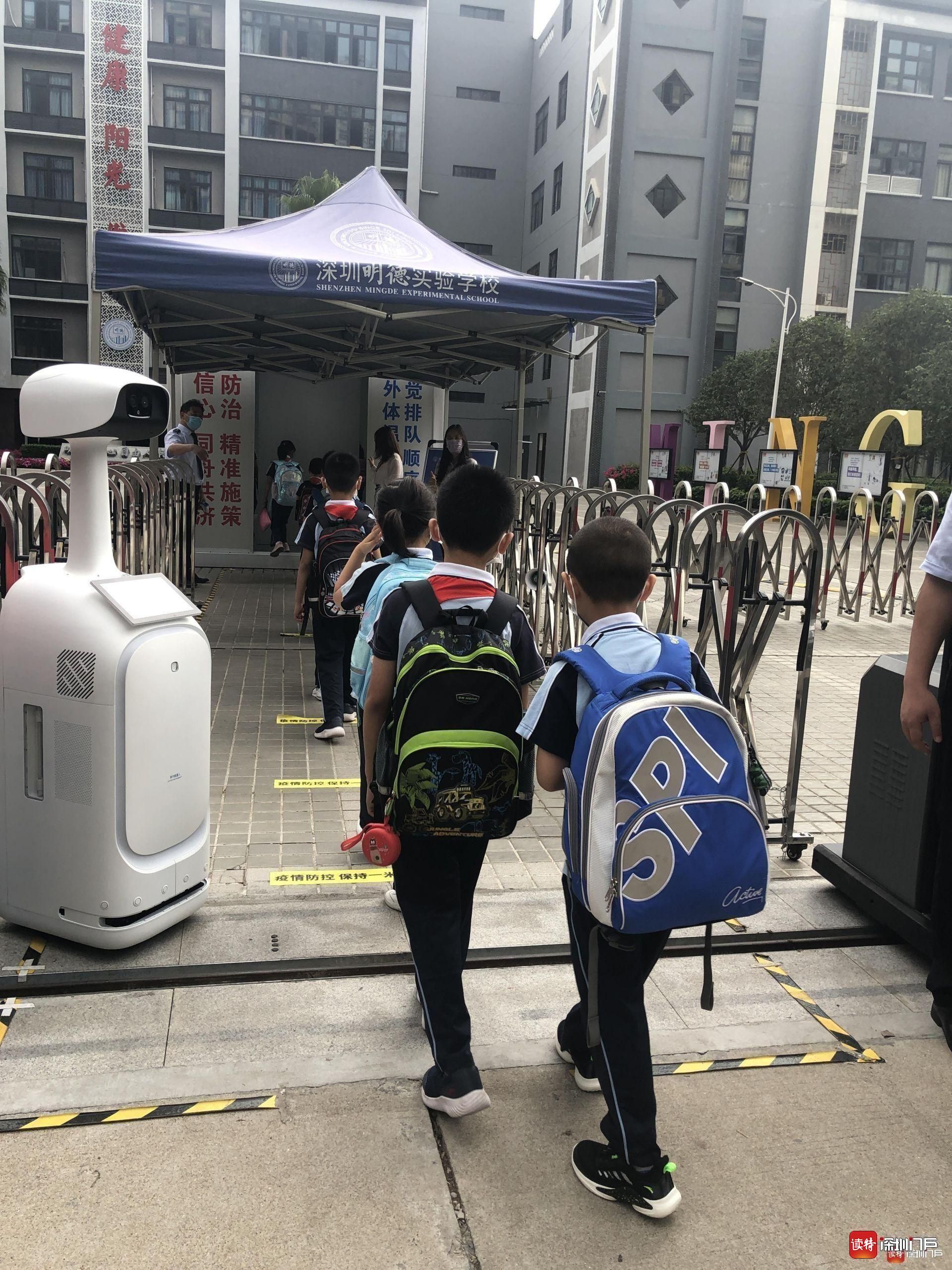“同學(xué)們好!”“歡迎回來(lái)!”從7點(diǎn)起,明德實(shí)驗(yàn)學(xué)校校長(zhǎng)魯江與工作人員就在香蜜校區(qū)校門(mén)口迎候?qū)W生們,提醒孩子們戴好口罩,也與家長(zhǎng)們交流返校事宜。校門(mén)口的一臺(tái)超氧水消殺機(jī)器人也在積極投入工作,工作人員在后臺(tái)控制面板可以監(jiān)測(cè)到入校人員的體溫情況。