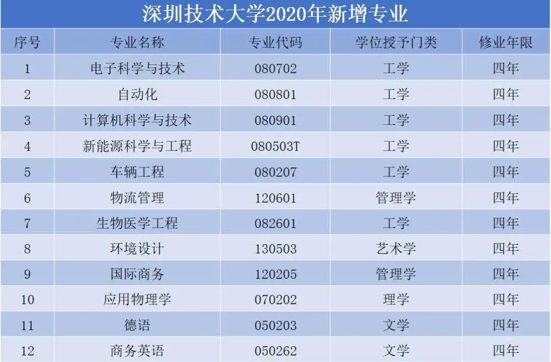據(jù)教育部2019年本科專業(yè)備案和審批結果,在2019年機械設計制造及其自動化、物聯(lián)網(wǎng)工程、光源與照明、交通運輸、汽車服務工程、工業(yè)設計等6個專業(yè)的基礎上,2020年,深圳技術大學將新增12個專業(yè),屆時招生專業(yè)將達18個。