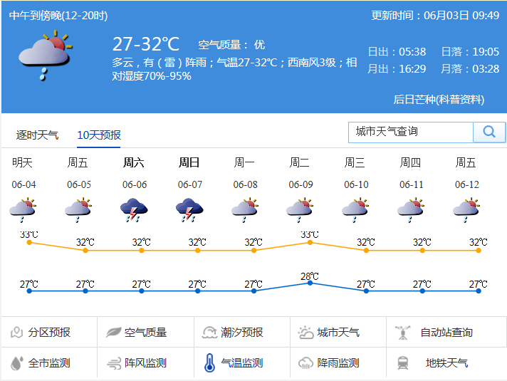 市氣象臺預測,3-4日多云,有雷陣雨,局部雨勢較大,3日氣溫27-32℃,天氣悶熱;5-7日降雨加大,有雷陣雨,局部暴雨,伴有雷暴和8級左右短時大風。