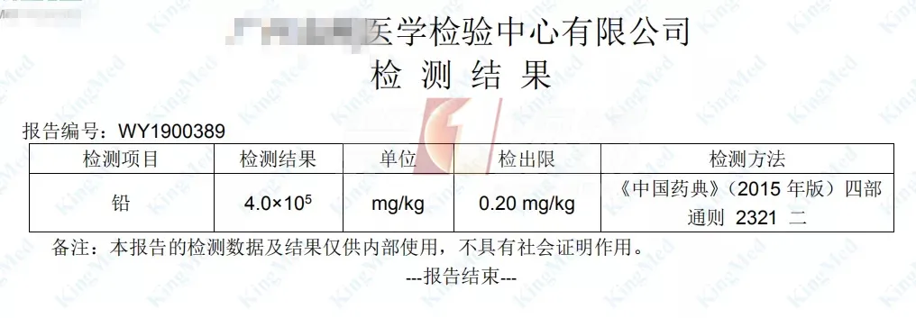 聽(tīng)了醫(yī)生的建議,孩子家長(zhǎng)將瓶子里的粉末拿到第三方檢測(cè)公司檢測(cè)。結(jié)果顯示,1克的藥粉里面,就含有大概0.4克的鉛!
