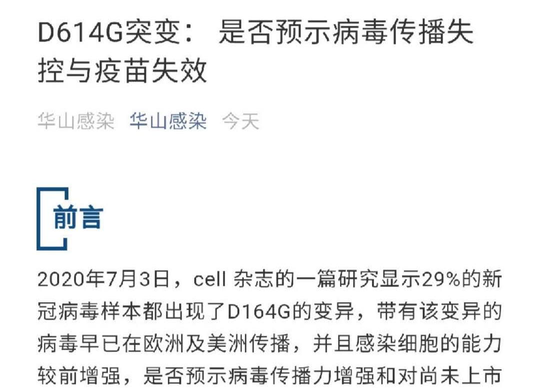 7月6日,上海復(fù)旦大學(xué)附屬華山醫(yī)院感染科主任張文宏通過微博談“29%新冠病毒樣本現(xiàn)D614G變異”一事。
