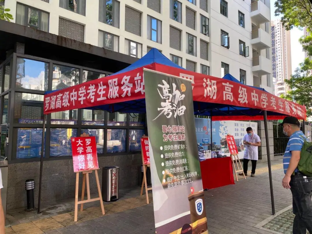 在羅湖高級中學(xué),記者看到,在校門口右側(cè),設(shè)置了服務(wù)站,里面為考生準(zhǔn)備了校服、文具、防疫用品、雨傘、紙巾、水等。