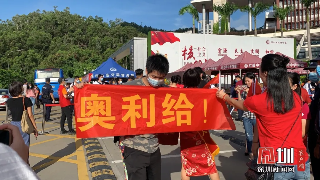 一名考生的學(xué)長來到深圳紅嶺中學(xué)考點門口,為學(xué)弟舉起“奧利給”的旗子!