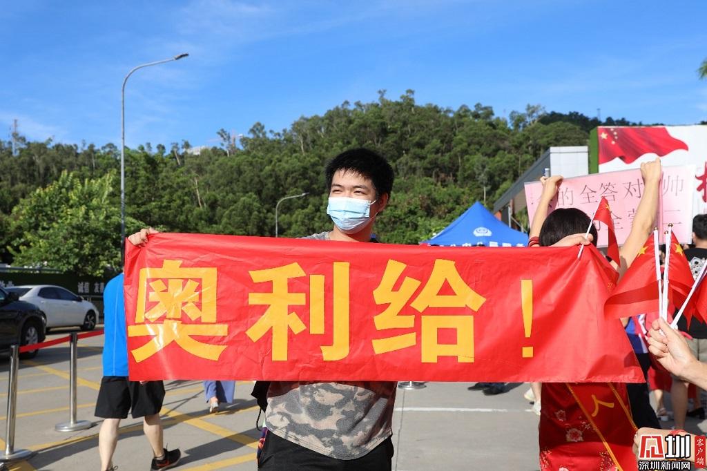 紅嶺中學(xué)考點外,“應(yīng)援團(tuán)”成員為考生們舉起“奧利給”橫幅。