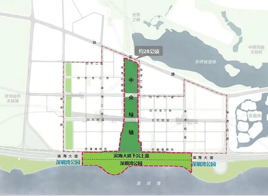 今年6月6日上午,該基地舉行中央綠軸項(xiàng)目開工活動(dòng),此次開工的中央綠軸項(xiàng)目南北全長(zhǎng)約1.0公里,最大寬度達(dá)210米,是連接塘朗山——華僑城濕地——深圳灣“通山達(dá)?!钡暮诵目臻g軸線。隨著濱海大道深超總段下沉工程建設(shè),未來(lái)深超總紅線內(nèi)景觀將與深圳灣公園無(wú)縫銜接,共同構(gòu)成南北貫通的中央綠軸體系。