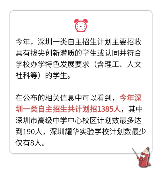 根據(jù)最新方案顯示,今年,深圳首次將公辦普通高中原體育、藝術(shù)特色團隊和體育、藝術(shù)術(shù)科特色班,民辦普通高中自主招生,全部納入普通高中學校自主招生計劃內(nèi)統(tǒng)籌安排。共有47所學校開展自主招生,按自主招生一類、自主招生二類設置招生類別。