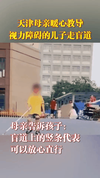 最近,天津一母親教視力障礙兒子走盲道的視頻火了。