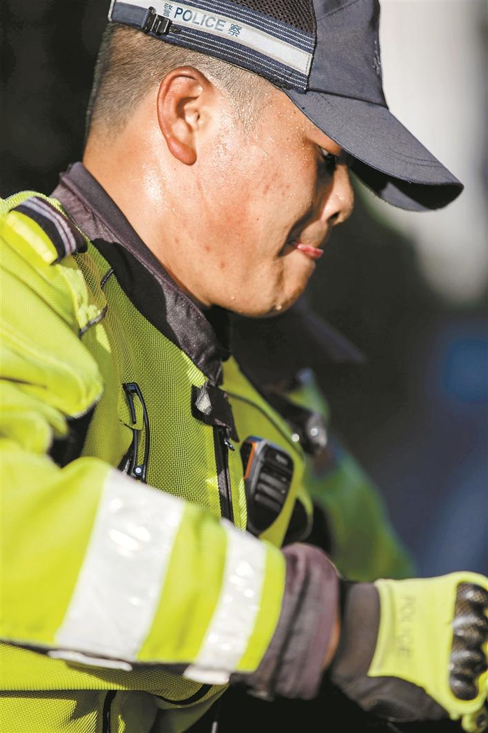 “深圳最近的天氣太熱了,到了中午,地面溫度估計得有40℃了,我們因為戴著口罩,外頭還得加上頭盔,感覺確實挺難受的?!鄙钲诮痪仙酱箨牂C(jī)訓(xùn)中隊的鐵騎小哥時云財,每天早高峰開始就駕駛鐵騎穿梭在大街小巷,直到中午太陽最盛的時候。摘下頭盔,眼睫毛上都是汗滴,更不用說脫下熒光黃的制服,里面是層層疊疊早已被浸透發(fā)白的衣衫。