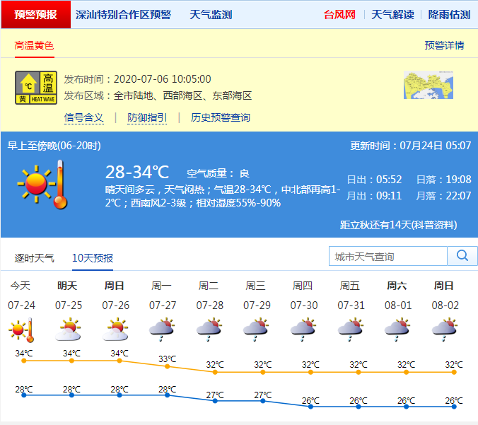 見圳客戶端·深圳新聞網(wǎng)2020年7月24日訊(見圳客戶端、深圳新聞網(wǎng)記者 陳婕 鄭曉鵬)老天熱“晴”不斷,今明兩天悶熱加劇。24日晴天間多云,天氣悶熱;氣溫28-34℃,中北部再高1-2℃;偏南風(fēng)3級(jí);濕度55%-90%。25日晴天間多云,最高氣溫34-35℃,中北部可達(dá)36-37℃。26日持續(xù)晴熱,局地有短時(shí)(雷)陣雨;27-29日多云,有短時(shí)(雷)陣雨;30日有陣雨或雷陣雨。