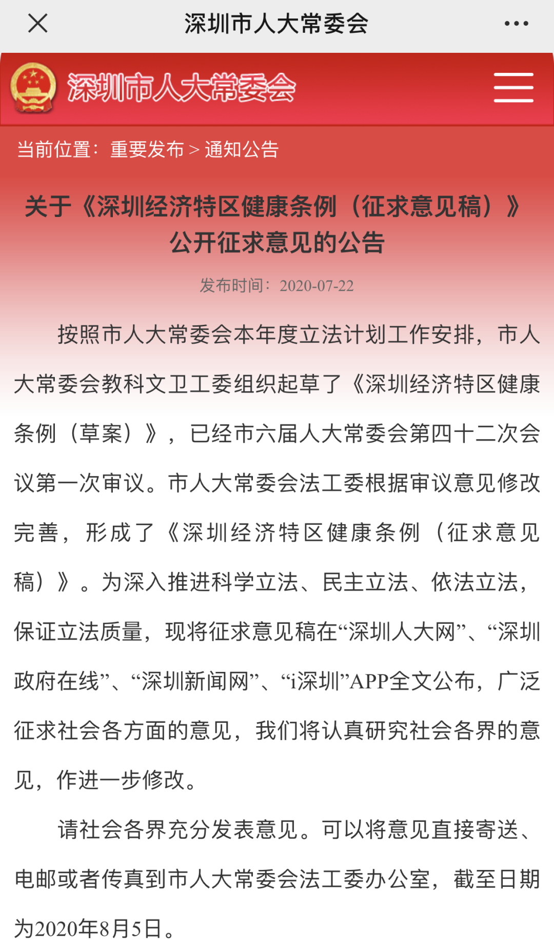 《征求意見(jiàn)稿》已在深圳人大網(wǎng)、深圳政府在線、深圳新聞網(wǎng)、“i深圳”APP全文公布,廣泛征求社會(huì)各方面的意見(jiàn)。