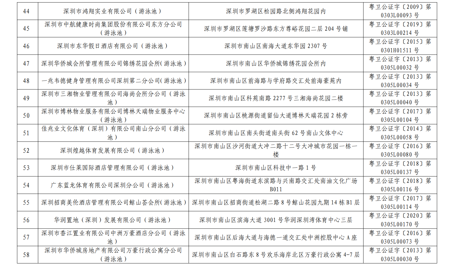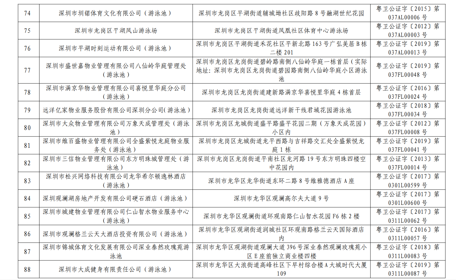 2020年深圳市游泳場所水質第一批抽檢結果合格單位一覽表(101家)