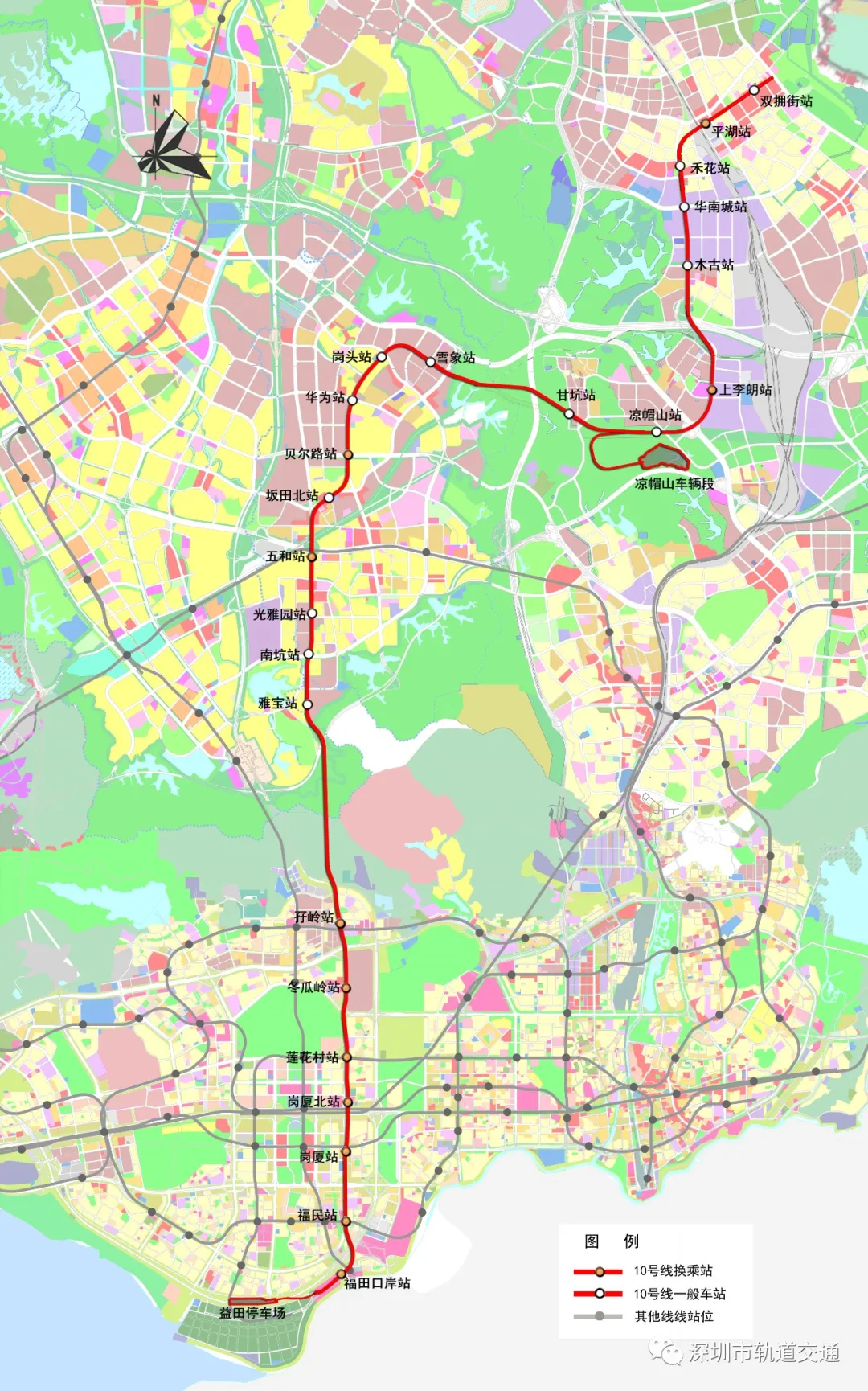地鐵10號線起自福田區(qū)福田口岸站,終至龍崗區(qū)雙擁街站,途經福田、龍華、龍崗3區(qū),線路全長約29km,采用全地下敷設方式,共設站24座(其中換乘站11座)。