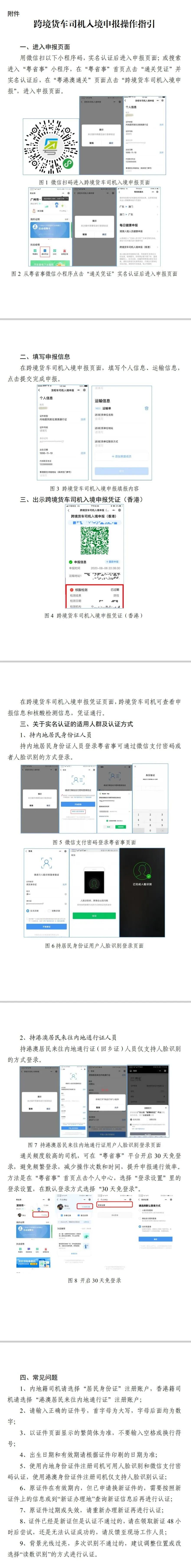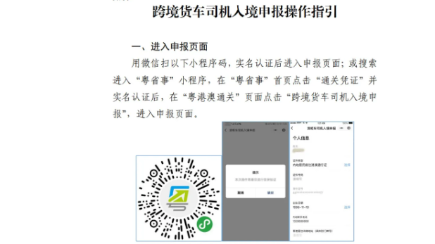 一、跨境司機(jī)入境前應(yīng)在“粵省事”微信小程序(粵省事—粵康碼—粵港澳通關(guān)—跨境貨車司機(jī)入境申報(bào))中準(zhǔn)確申報(bào)運(yùn)輸作業(yè)任務(wù)相關(guān)信息,包括作業(yè)目的地詳細(xì)信息(工廠/倉(cāng)庫名稱及所在街道)、內(nèi)地手機(jī)號(hào)碼及相關(guān)個(gè)人信息,相關(guān)操作指引詳見附件。入境后所申報(bào)手機(jī)號(hào)碼將會(huì)接收提醒短信。未安裝GPS定位系統(tǒng)和ETC電子不停車收費(fèi)系統(tǒng)的入境貨車,需按照相關(guān)部門安排前往指定場(chǎng)地免費(fèi)安裝GPS和ETC系統(tǒng)。